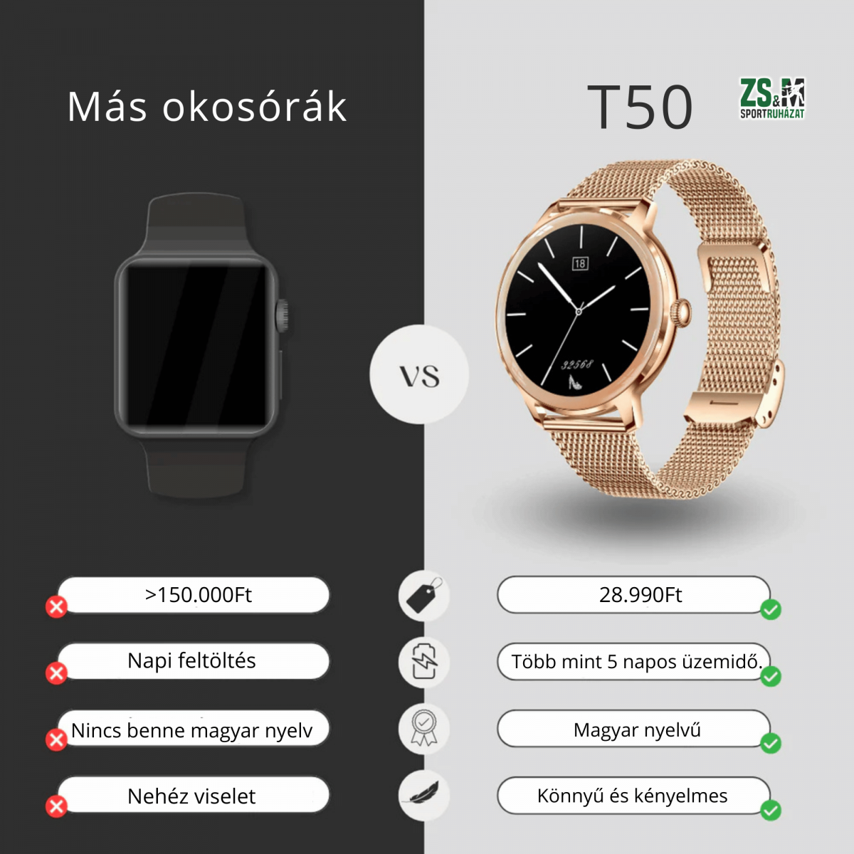 T50 Bluetooth Okosóra magyar nyelvű kezelőfelülettel és extra szíjjal