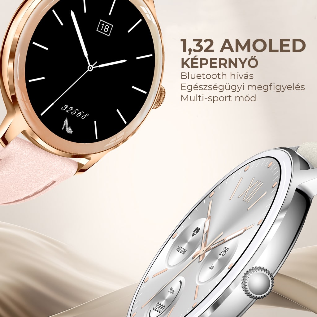 Ez a készülék egyszerre kínál stílusos megjelenést és sokoldalú használhatóságot. A karcsú, mindössze 7,9 milliméter vastag házban egy 1,32 colos AMOLED kijelző kapott helyet, melynek 466x466 pixel felbontása és 99,5%-os Adobe RGB színskálája éles és élénk képi megjelenítést garantál. A csomagban egy kényelmes szilikon-bőr kombinációjú szíj és egy elegáns Milánói stílusú fém pótszíj található.