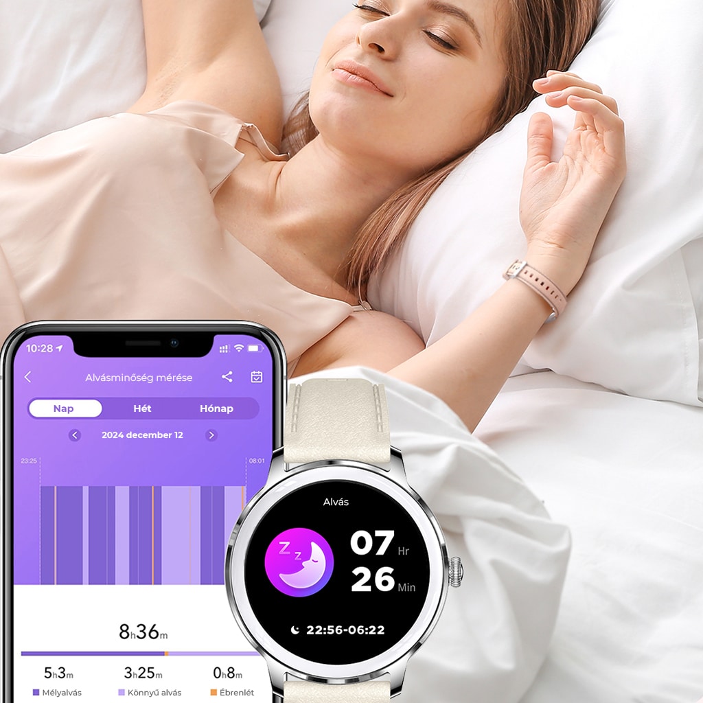 Alvásminőség mérés: Az óra részletes grafikont készít az alvás mennyiségéről és minőségéről, elkülönítve a mély és felületes alvási fázisokat, valamint az ébredéseket. Az adatok az ébredést követő másfél órában szinkronizálódnak az alkalmazással.