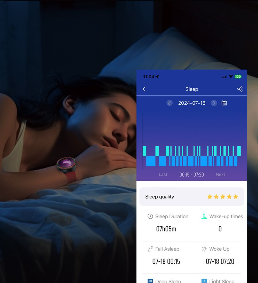 Alvásmonitorozás: Az okosóra részletes grafikont készít az alvás mennyiségéről és minőségéről, elkülönítve a mély és könnyű alvási fázisokat, valamint az ébredéseket. Az adatok az ébredést követő másfél órán belül kerülnek véglegesítésre az alkalmazásban.