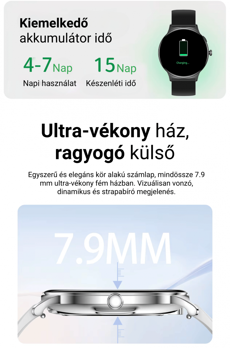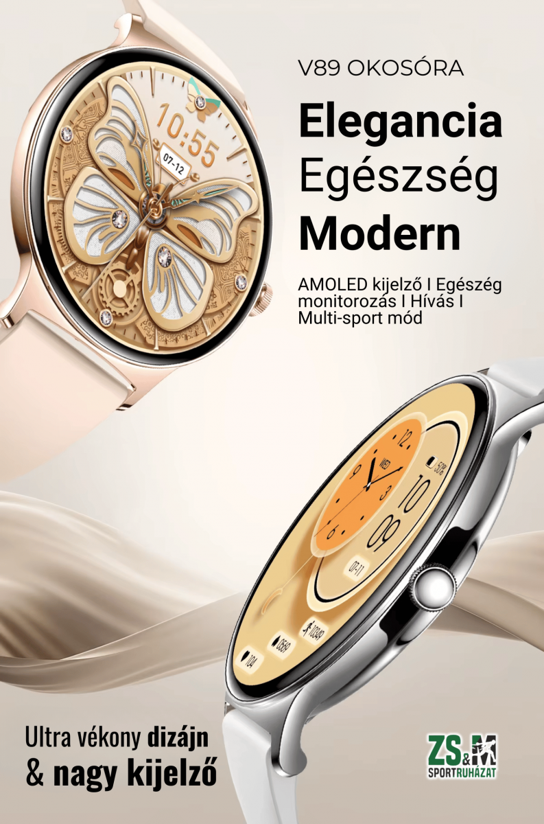 A V89 Magyar nyelvű Bluetooth hívásos okosóra 1,43 hüvelykes AMOLED kijelzővel rendelkezik, amely 466×466 pixeles felbontásának köszönhetően éles és élénk képet biztosít. Az okosóra és a hozzá tartozó applikáció teljes mértékben magyar nyelvű, így a használata nagyon egyszerű és kényelmes. Az órához alapból egy szilikon szíj tartozik, emellett pedig ajándékba kapsz egy stílusos Milánó fém pótszíjat is.