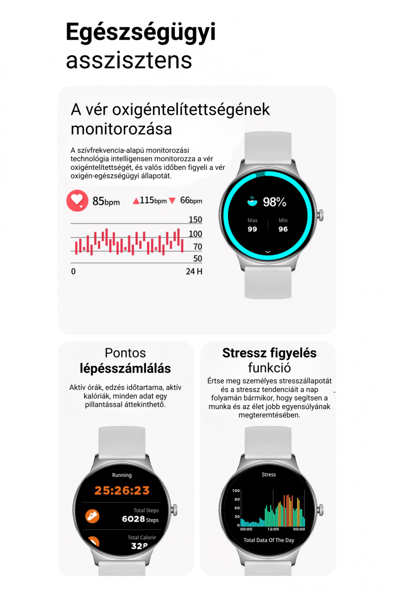 Egyéb funkciók: tétlenség figyelő, alvásfigyelő, értesítések megjelenítése, képernyőváltás, telefonkereső, stopper, aktivitás emlékeztető, ébresztő, kamera vezérlés és lopásgátló.
