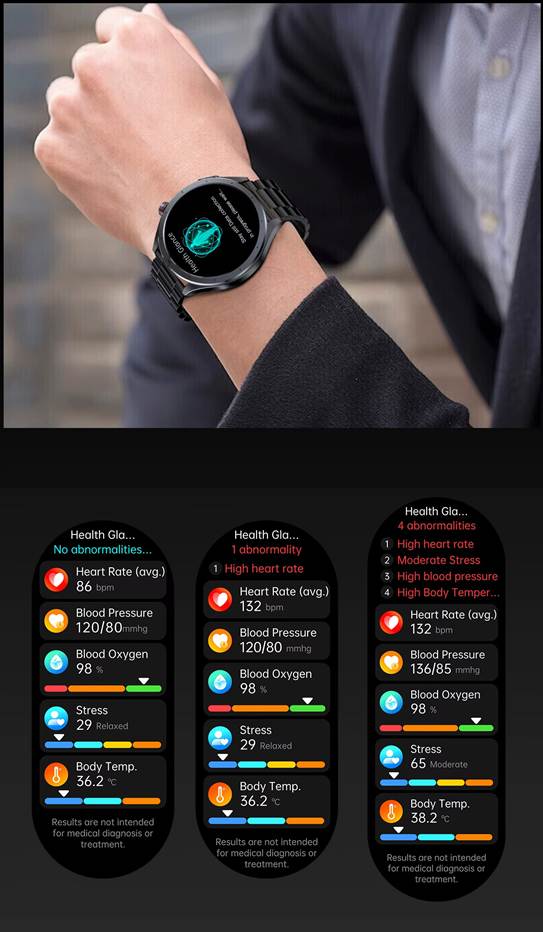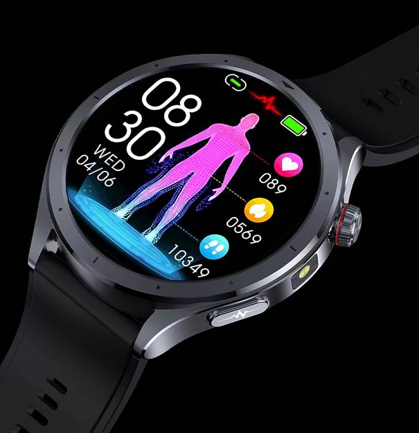 - Fejlett egészségfigyelő rendszer: EKG, vérnyomás, SpO₂, testhőmérséklet